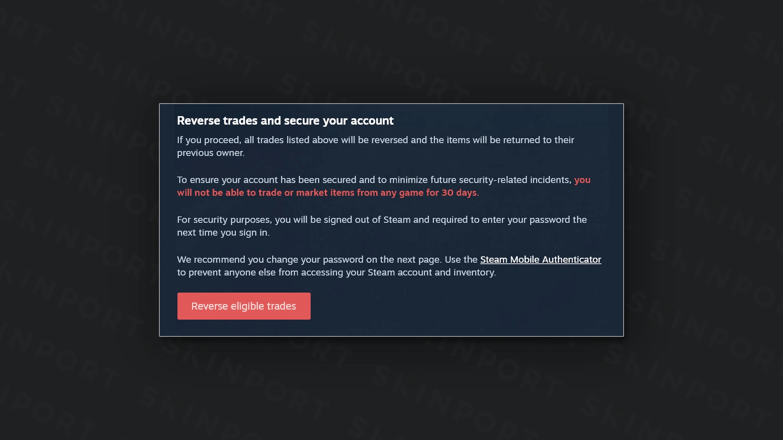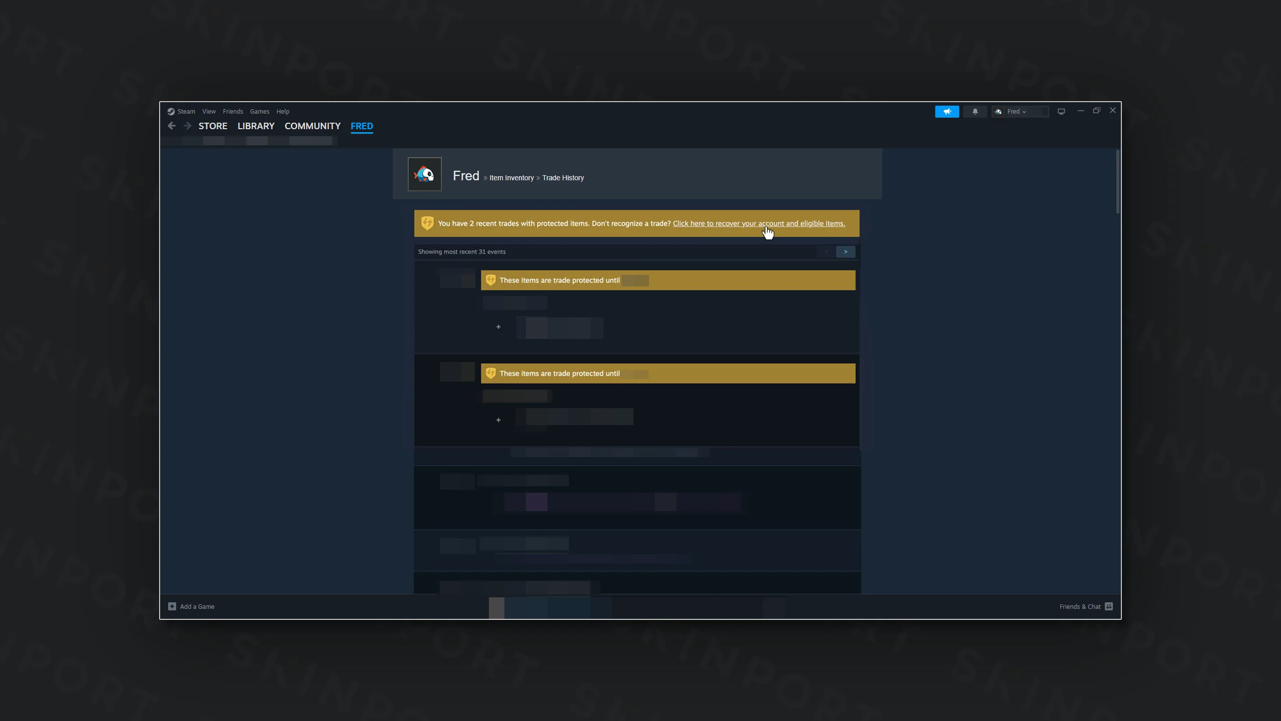 Die Items, die du in den letzten 7 Tagen getauscht hast, werden an ihre ursprünglichen Besitzer zurückgegeben, inklusive der Skins, die dir gestohlen wurden. Wenn Skins zurück an Skinport-Bots gehen, erscheinen diese innerhalb von 24 Stunden in deinem Skinport-Inventar